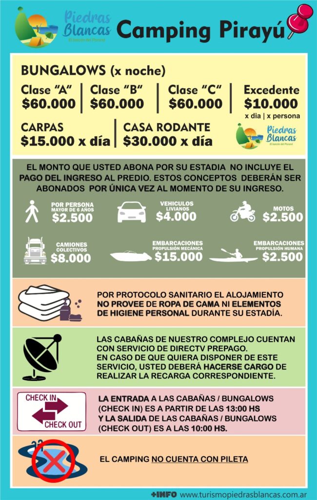 El Camping Pirayú pone a disposición del visitante numerosas prestaciones y comodidades que aseguran jornadas de disfrute placentero, el lugar está enclavado sobre las barrancas que acompañan el paso del Río Paraná, las mismas que le han dado el mote a Piedras Blancas como «El Balcón del Paraná».